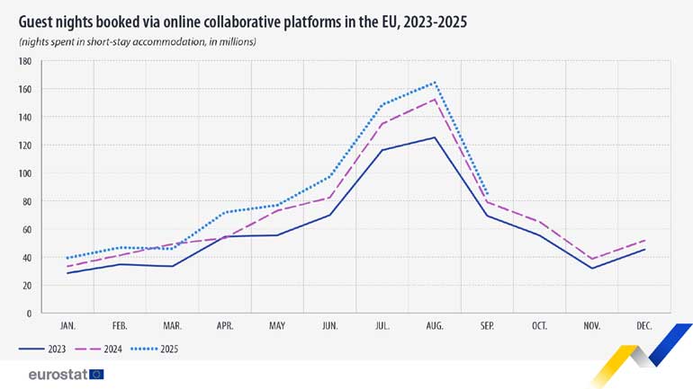 Entre julho e setembro de 2025, os hóspedes passaram 398,1 milhões de noites em alojamentos de curta duração na União Europeia, reservados através das plataformas Airbnb, Booking ou Expedia, segundo indicam os dados do Eurostat. O número total de noites passadas por hóspedes no terceiro trimestre de 2025 aumentou 8,7% em comparação com o mesmo período de 2024 e 28,2% face ao terceiro trimestre de 2023.